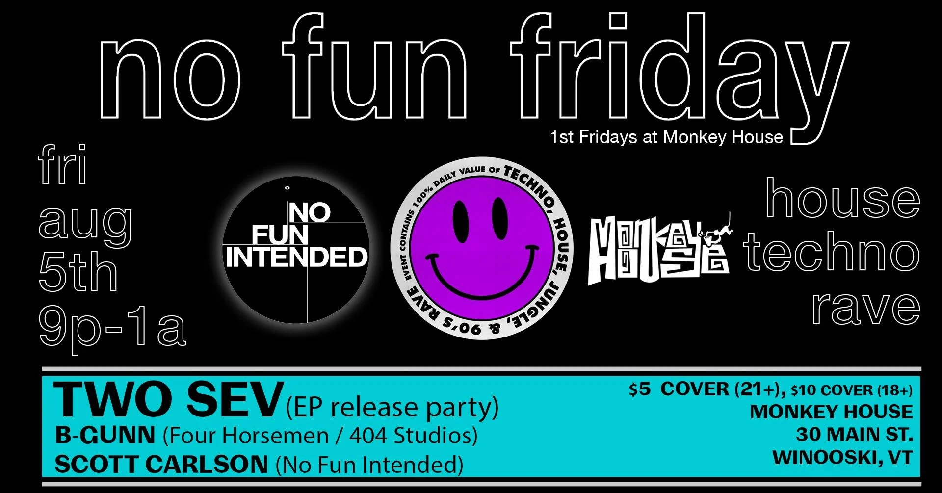 This month featuring TWO SEV's release party as he debuts on No Fun Intended with a blistering ravey house 4 track EP. Joining us on direct support is Burlington staple B-Gunn, plus No Fun resident Scott Carlson warming things up.