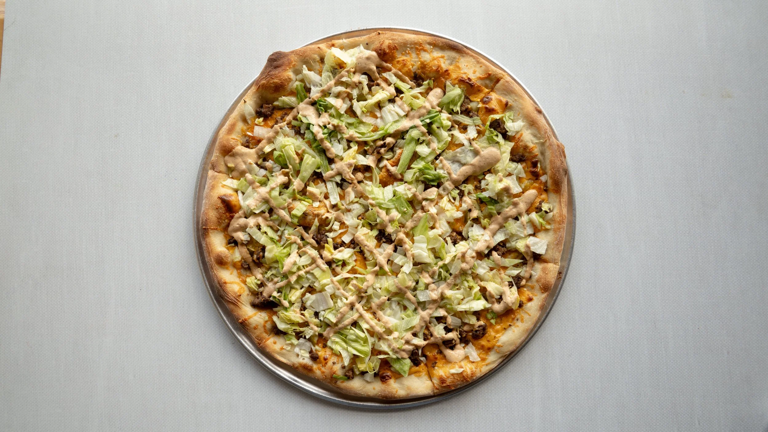 House made dough, ground beef, American cheese, onion, pickles, sesame seeds, lettuce, cheddar, special sauce.