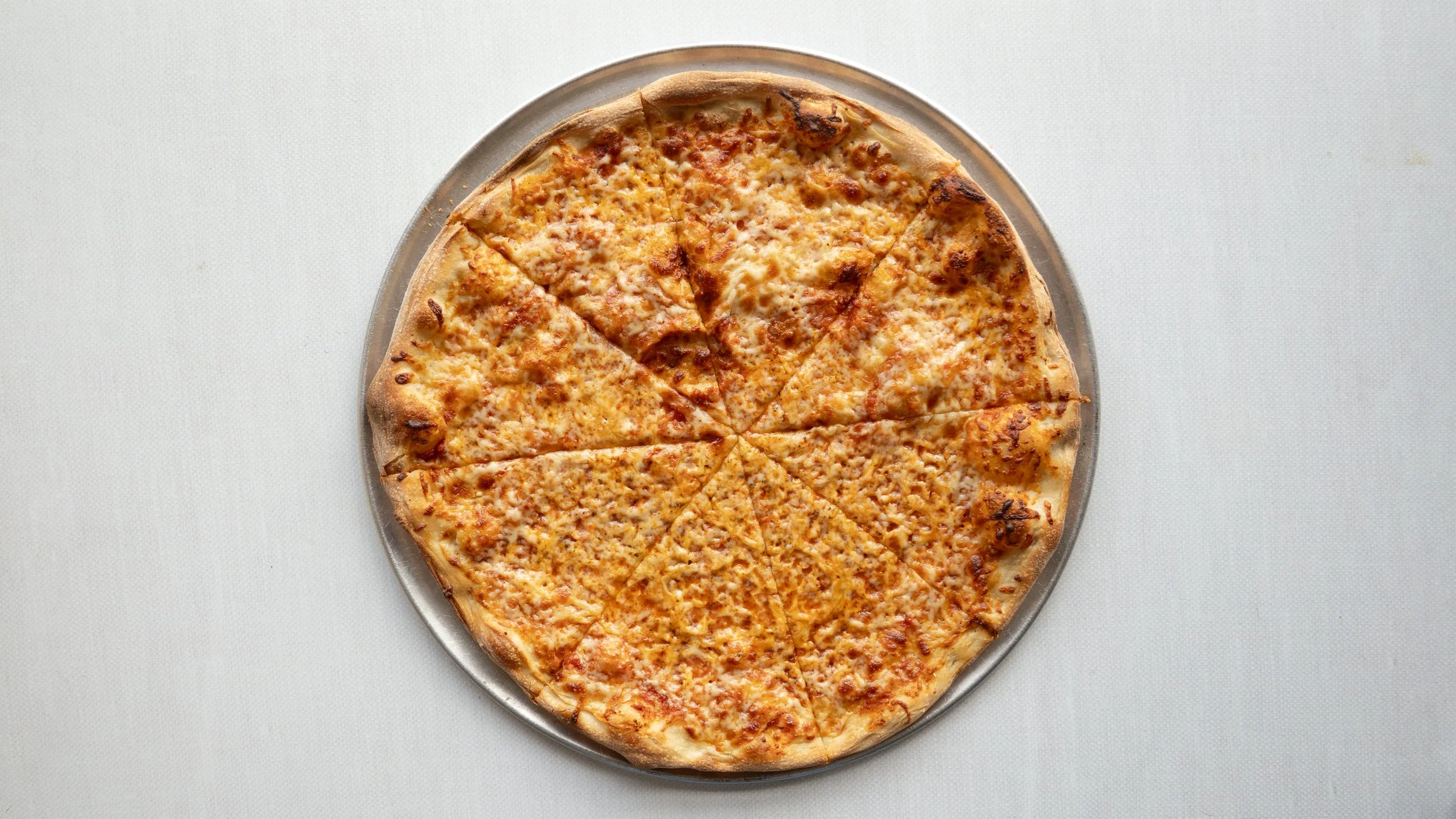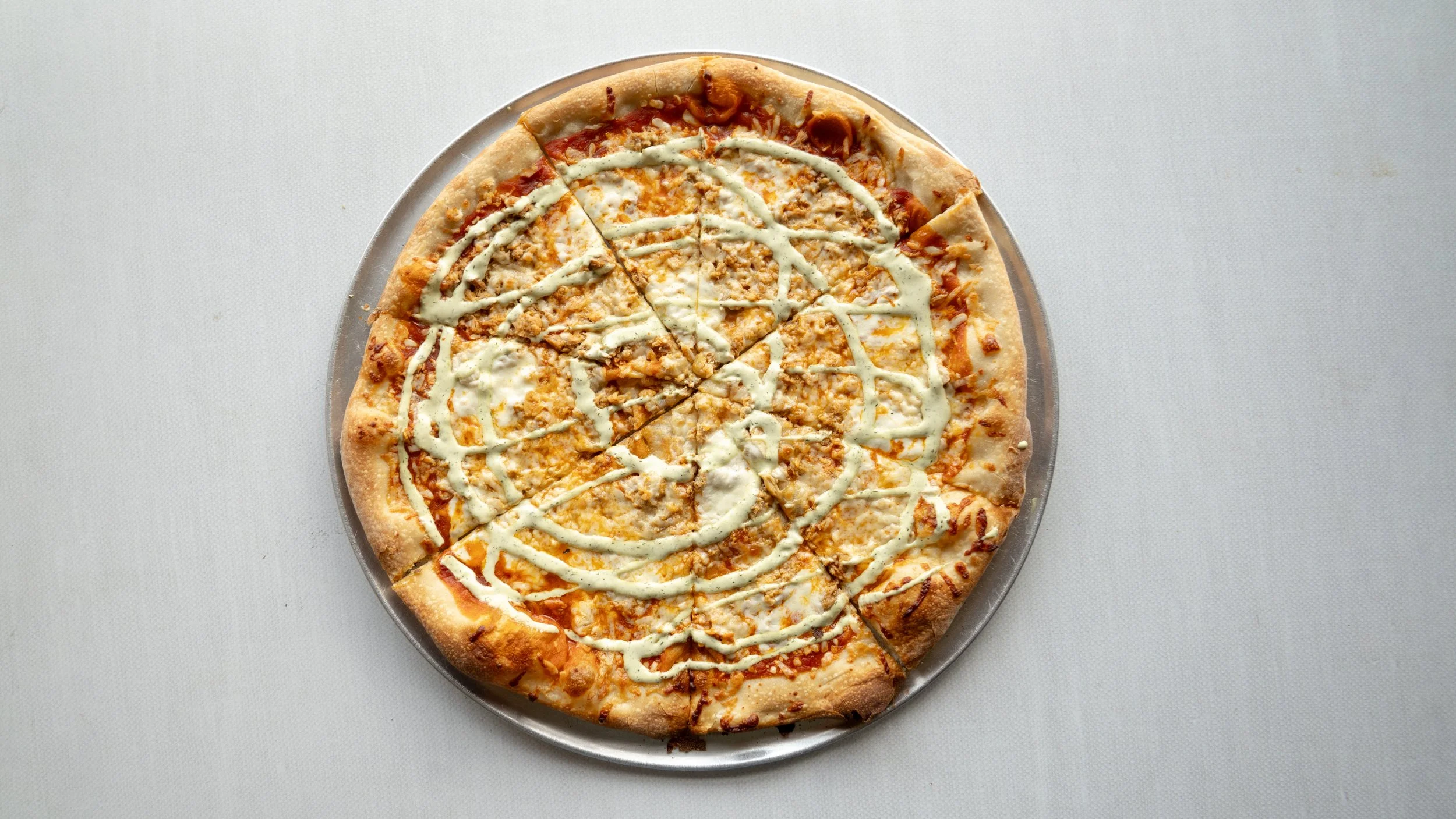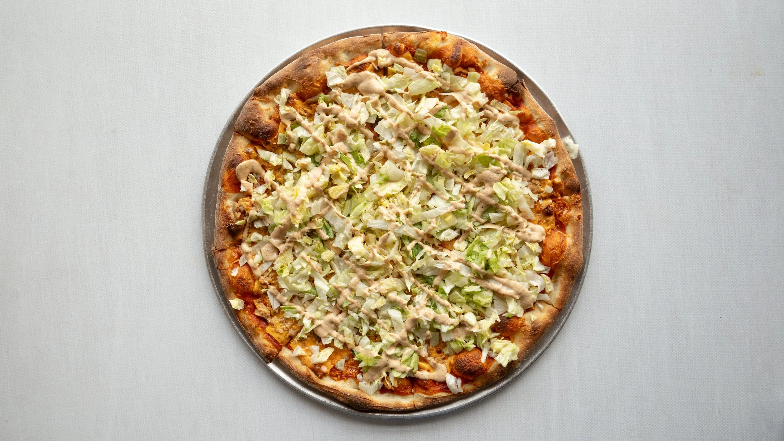 Fresh homemade sourdough crust, american cheese, spicy sauce, spicy chicken, onions, pickles, cheddar cheese, light mozzarella cheese, sesame crust, topped with shrettuce & house ranch.