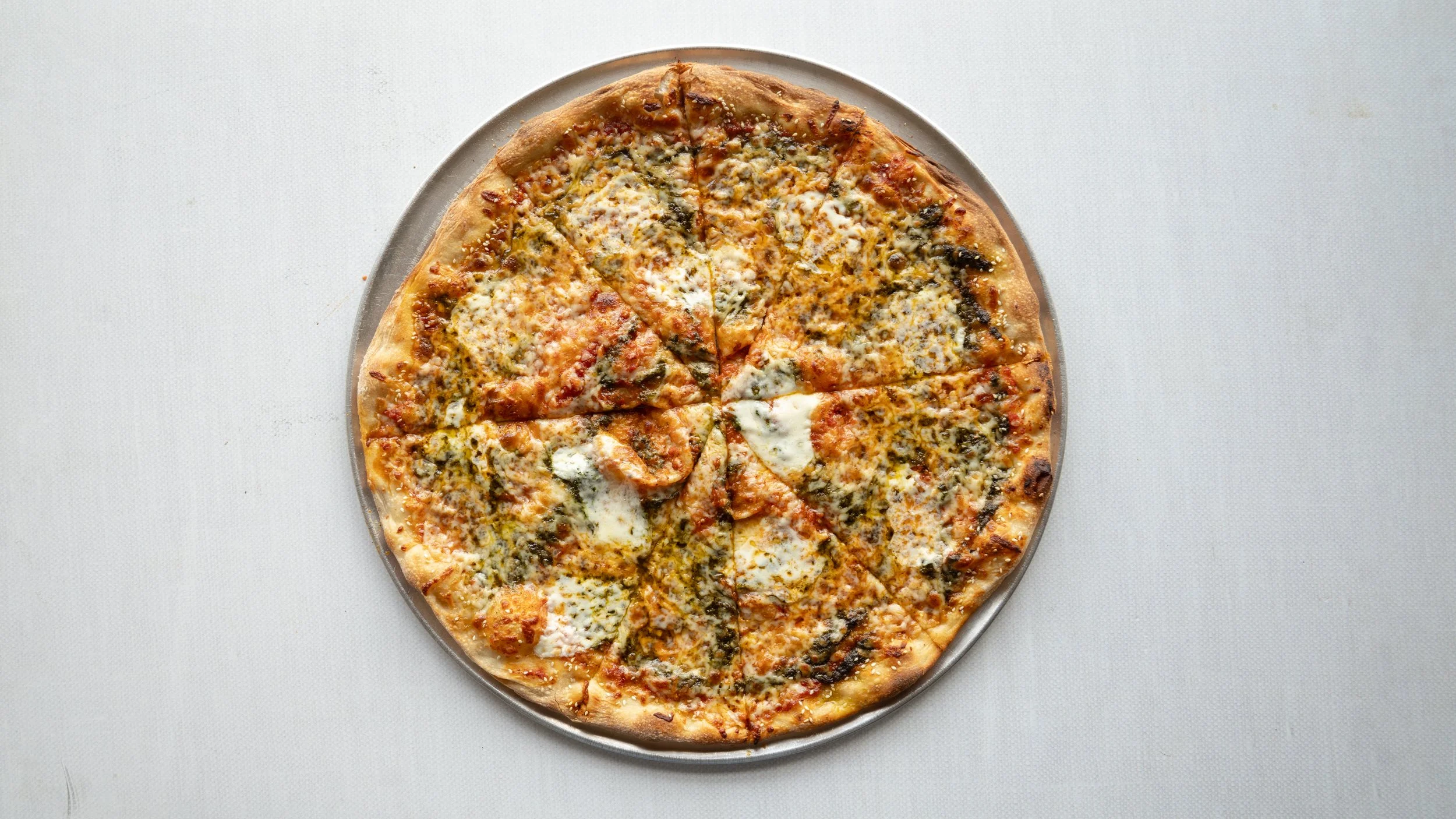 House made dough and red sauce, pesto (no nuts), mozzarella cheese, sesame seed crust.